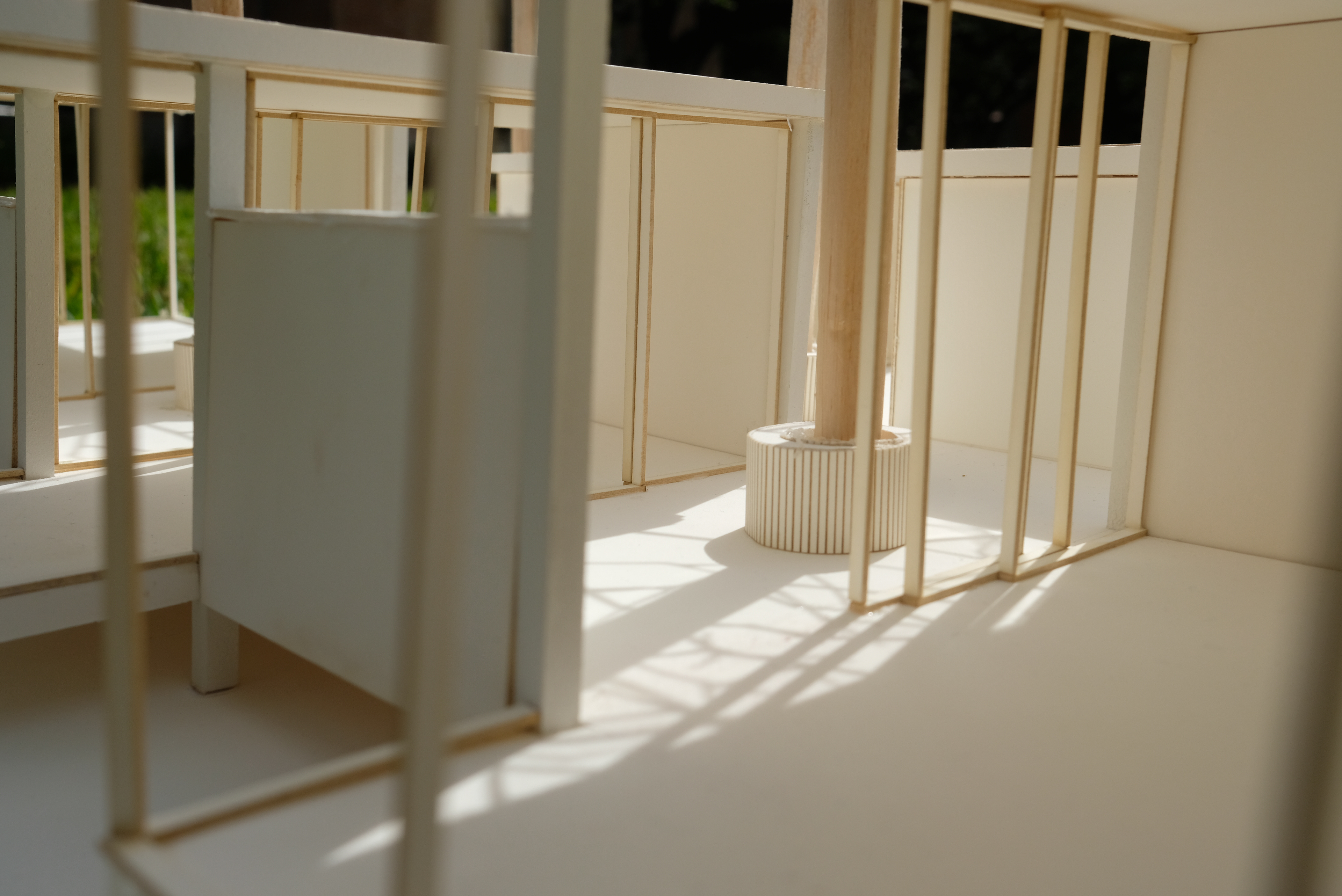 During the day, the compartmentalized design affords spaces for individual and small group activity, with an intended use for meditative and relaxing activity that rejuvinates the mind and body. Yet, the design affords flexibility through glass sliding doors and movable furniture, and many other activities could be carried out here.