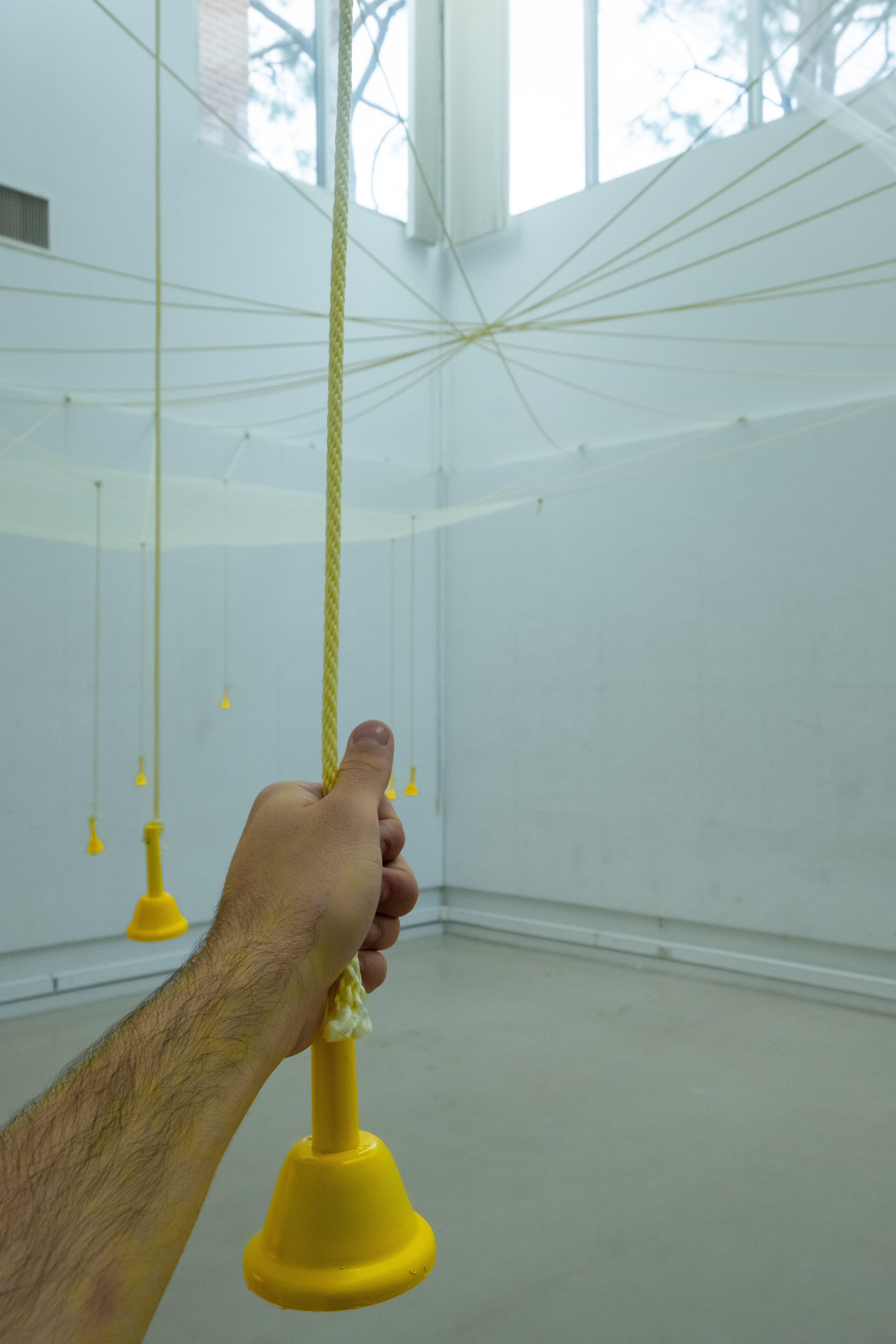 Using an angled pulley and rope system affixed to a dual mesh suspension, this installation in the Jury Room provides a visual and aural demonstration of the concept of duality. The audience is given the choice of being a viewer, listener, and/or actor. As an actor pulls down one rope, their force lowers the direct overhanging mesh, rings the bell, heightens the mesh at the corresponding rope connected to the same two pulleys, and rings the corresponding bell. As this continues throughout the various ropes in the room, the audience observes each distinct action-reaction duo in its creation of a different form and sound. In finding the specific pairs of ropes and bells, the audience confronts the role that each duo plays in its larger network. “Every action” speaks to the reality that a specific duo can be temporary, whether in location, intensity, or effect, but the occurrence of duos is permanent.