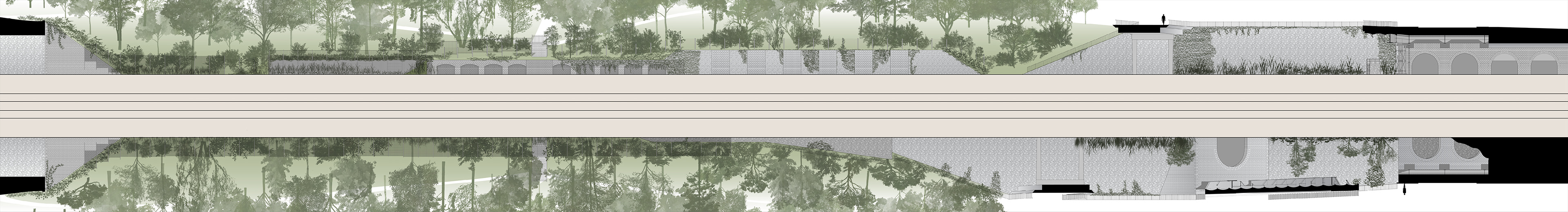 The proposal encloses the undercroft and adjacent bridge, creating a bathhouse where the water collected by the trench becomes occupiable, and visitors mingle with plants in a controlled interior garden. A series of enclosed pools offer a circuit typical of a public baths, with pools of varying temperatures. The infrastructure to support this program is installed in the tunnel extending to the North of the undercroft.